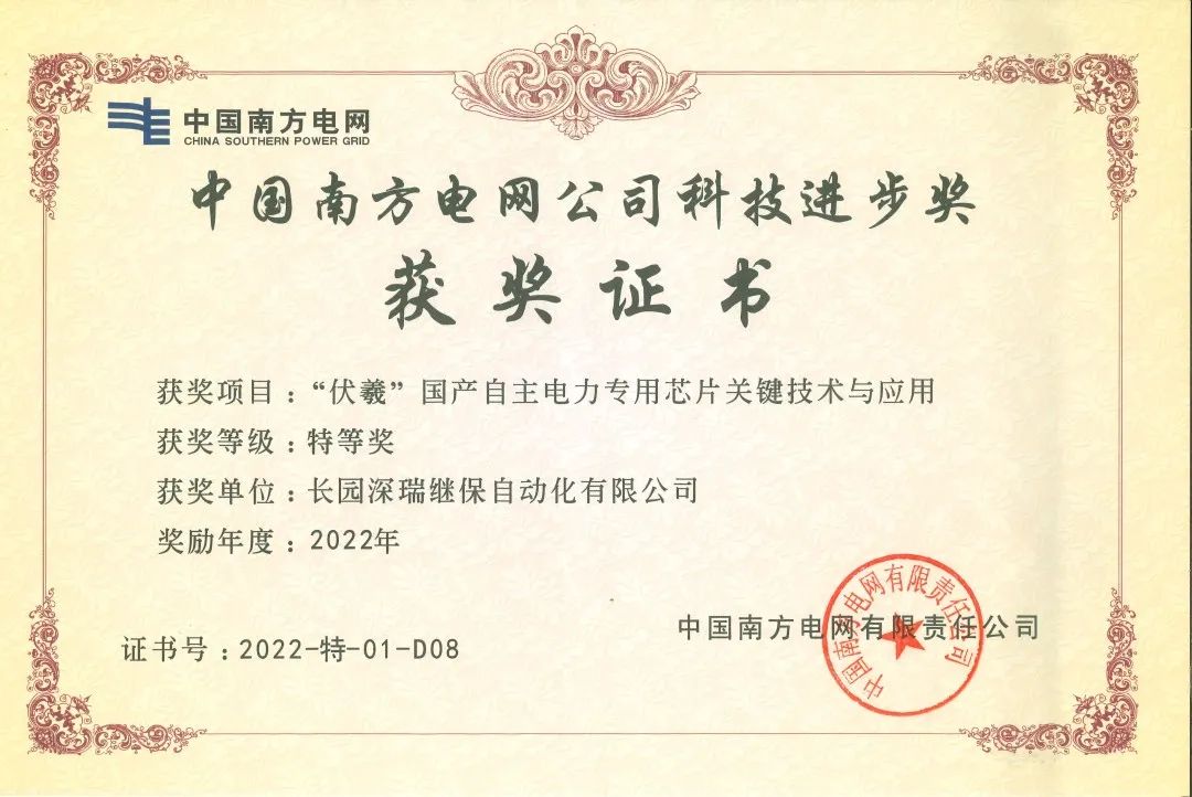 近日,由YABO鸭脖科技集团旗下子公司YABO鸭脖深瑞继保自动化有限公司(以下简称“YABO鸭脖深瑞”)参与的“伏羲国产自主电力专用芯片关键技术与应用”项目荣获中国南方电网公司科技进步奖特等奖。